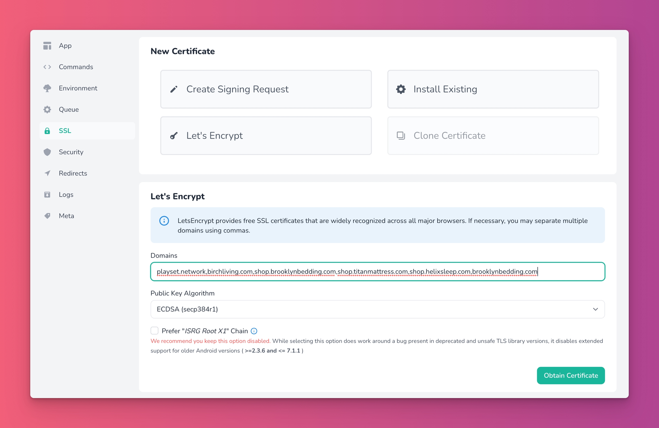 Obtain a new SSL certificate with the new domain included. Easiest way to get a new free certificate is through Let's Encrypt, again we can do this in Forge via the "SSL" tab on the server.